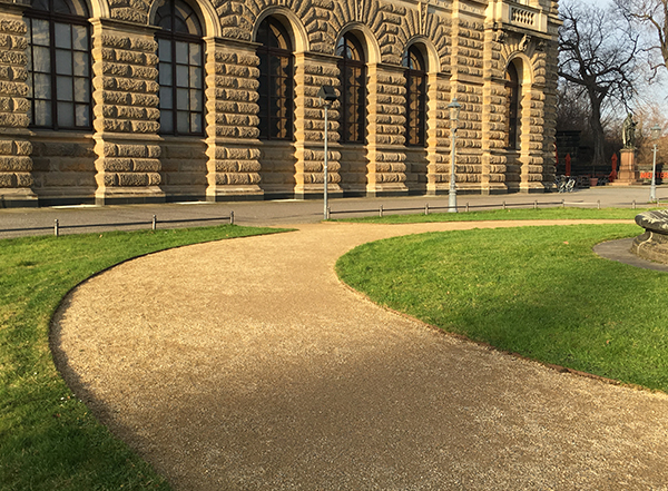 ◇ 素土铺装是以粘土、风化土等现地土壤(现场土壤)为主要材料,加入特殊硬化剂的混合材料进行的道路铺装。道路保有土壤原本的色彩和景观效果,但雨天,道路不会积水,不会泥泞,行走舒适。
